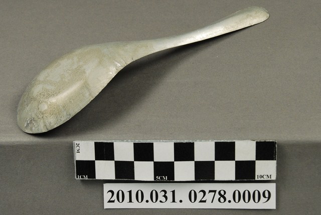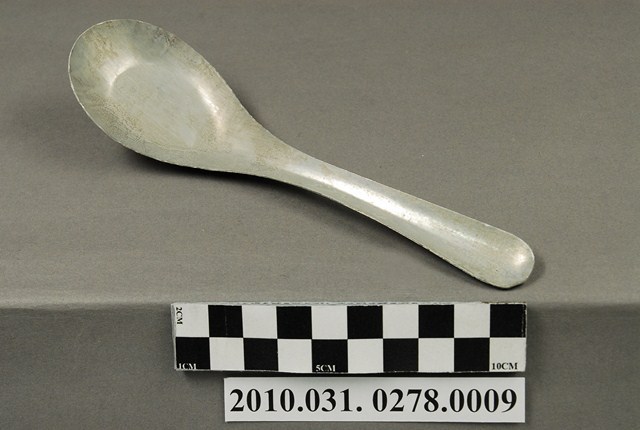 本件為麵茶攤組配件之一吃麵茶用的金屬湯匙,長約17公分,寬約4.6公分,高約3.5公分,整體表面有氧化痕跡。湯匙為中餐式湯匙,柄與匙一體成形製成,匙的部分為平底,匙壁深廣。整體並無任何裝飾與紋樣,邊緣有些微壓痕,應是於生產過程中產生。此湯匙為麵茶攤提供予消費者飲食用。
