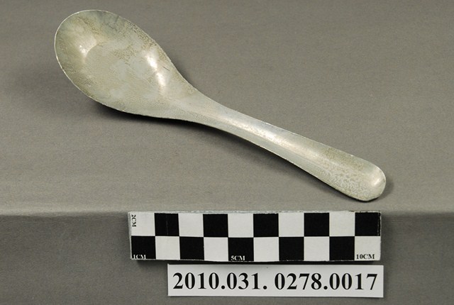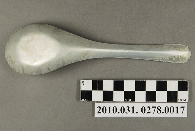 本件為麵茶攤組配件之一吃麵茶用的金屬湯匙,長約17公分,寬約4.6公分,高約3.5公分,整體表面有氧化痕跡。湯匙為中餐式湯匙,柄與匙一體成形製成,匙的部分為平底,匙壁深廣。整體並無任何裝飾與紋樣,邊緣有些微壓痕,應是於生產過程中產生。此湯匙為麵茶攤提供予消費者飲食用。