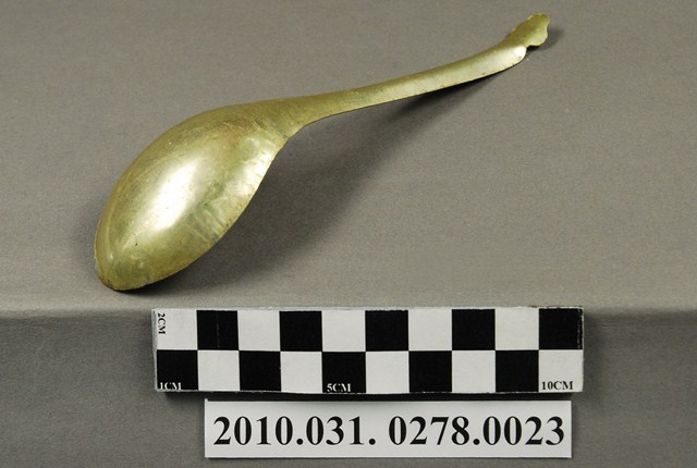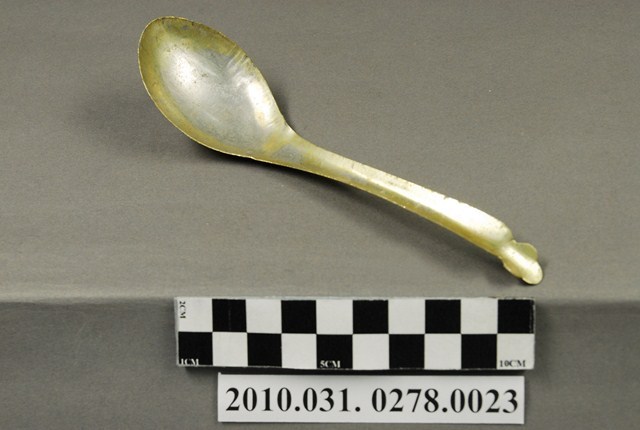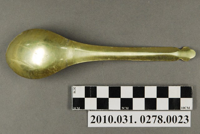 本件為麵茶攤組配件之一吃麵茶用的金屬湯匙,長約15.4公分,寬約4公分,高約3.4公分,整體表面有氧化痕跡。湯匙為中餐式湯匙,柄與匙一體成形製成,柄的部分頂端裁切成花形邊緣,匙的部分圓弧深廣。整體並無任何裝飾與紋樣,邊緣有些微壓痕,應是於生產過程中產生。此湯匙為麵茶攤提供予消費者飲食用。