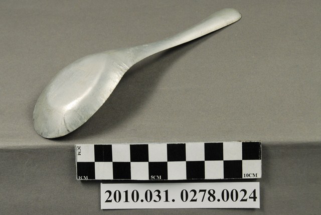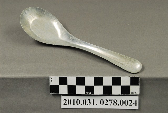 本件為麵茶攤組配件之一吃麵茶用的金屬湯匙,長約17公分,寬約4.6公分,高約3.5公分,整體表面有氧化痕跡。湯匙為中餐式湯匙,柄與匙一體成形製成,匙的部分為平底,匙壁深廣。整體並無任何裝飾與紋樣,邊緣有些微壓痕,應是於生產過程中產生。此湯匙為麵茶攤提供予消費者飲食用。