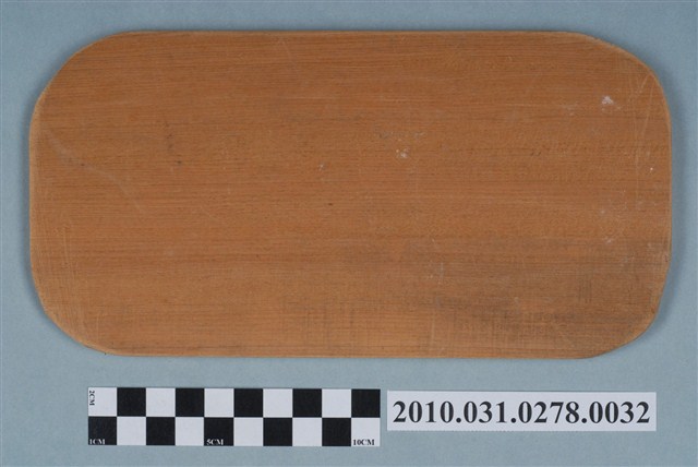 本件為麵茶攤組配件之一擋水板,由一塊木板製成,長約21.7公分,寬約11公分,高約0.7公分,整體呈圓角矩形面板。擋水板為木頭原色,表面除木頭原有的紋路外,有些許髒汙痕跡與刮痕或磨痕,四個原角部分並不圓滑,有明顯折角與打磨痕跡。