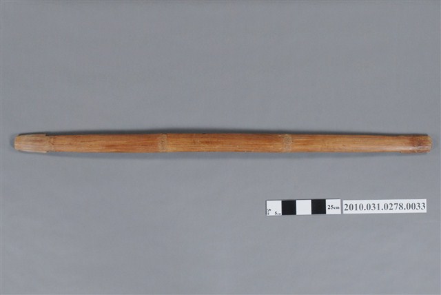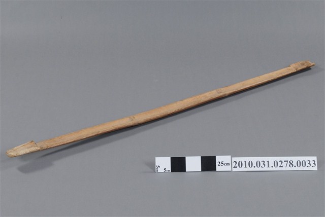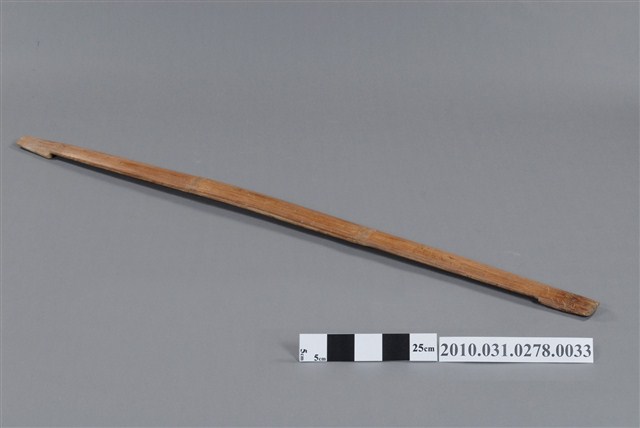 本件為麵茶攤組配件之一麵茶攤的竹製扁擔,以竹子剖開後製成,長約140.1公分,寬約6.4公分,高約5公分。扁擔整體為竹子原色,中間段最寬,兩端較窄,有微微弧度。兩端各削出一個凹折,使端頭略大於桿子部分,以防止東西掉下來。此扁擔為麵茶攤用來挑裝著煮麵茶設備的兩個高櫃使用,小販挑著扁擔沿街販賣,視需要隨時將扁擔停下來就可做生意。