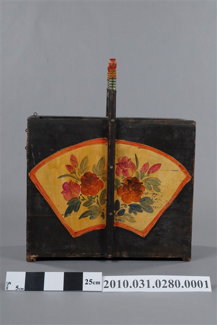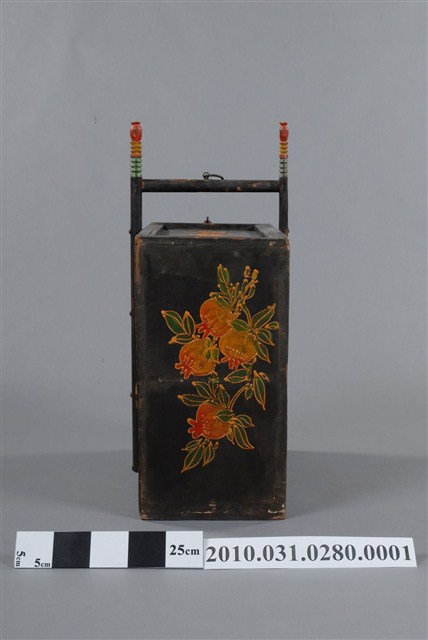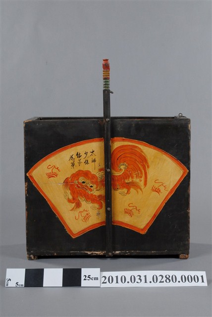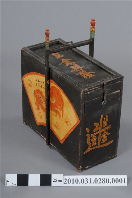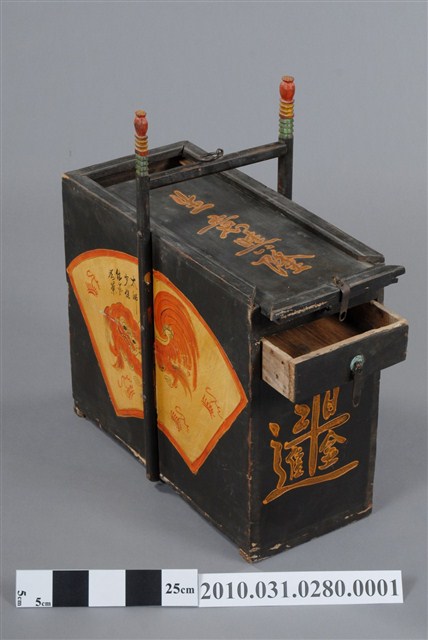 1.本物件為日進斗金木箱,為早期攤販挑物、放置物品的器物,為一黑色長方形的木箱,兩旁有2根木棍連接上方1根橫向的木棍形成提把,提把中央有一鐵環,可掛於扁擔上。箱子上方木板可打開,正前方有抽屜,可放置工具。木箱四面皆印有圖案,正面印有金色「日進斗金」的組合字,順時針轉動箱子,下一面為一扇形圖案,內部繪有花卉;下一面為金線描成的石榴圖案;下一面為一扇形圖案,內部為一橘色獅子的吉祥圖案,上方寫有文字「太師、少保、位□、為□」,最上方寫有1行金色文字「生意興隆」。