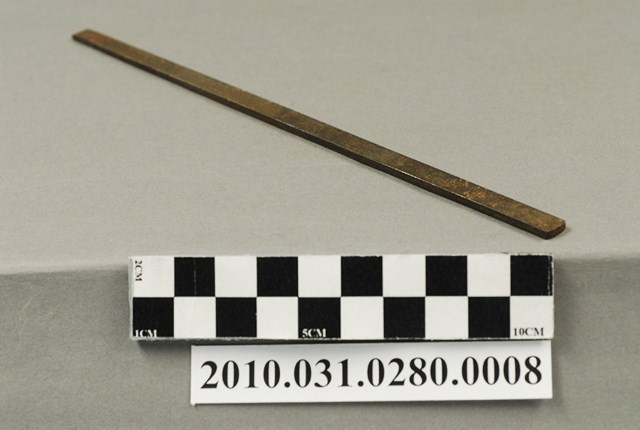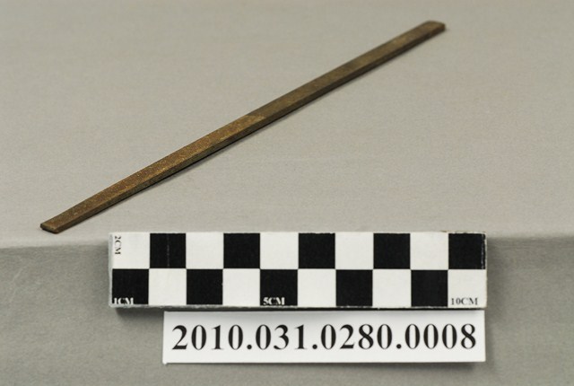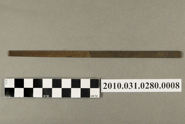 1.本物件為平銼,為手工用具,用於去除工件上的微量部分,常用於手工工作,整體橫切面為扁平的方形,一邊具有網狀或齒狀凸起,可以磨擦方式清除物件表面細小的區塊,一邊為把手部分。金屬部分已生鏽。