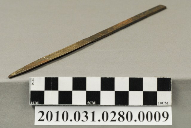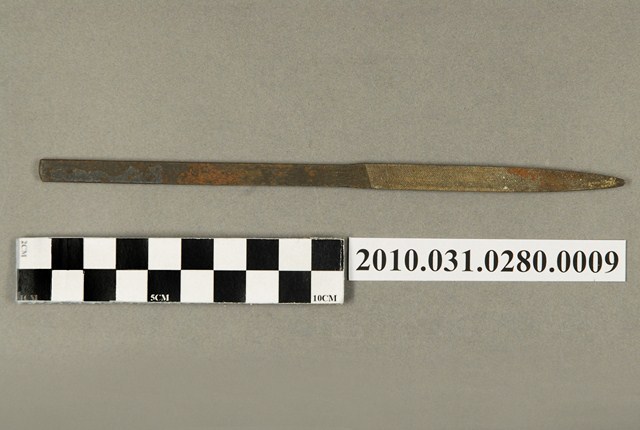 1.本物件為半圓銼,為手工用具,用於去除工件上的微量部分,常用於手工工作,形狀扁平,一邊具有網狀或齒狀凸起,可以磨擦方式清除物件表面細小的區塊,至尾端收縮變細,一邊為扁平的把手部分。金屬部分已生鏽。