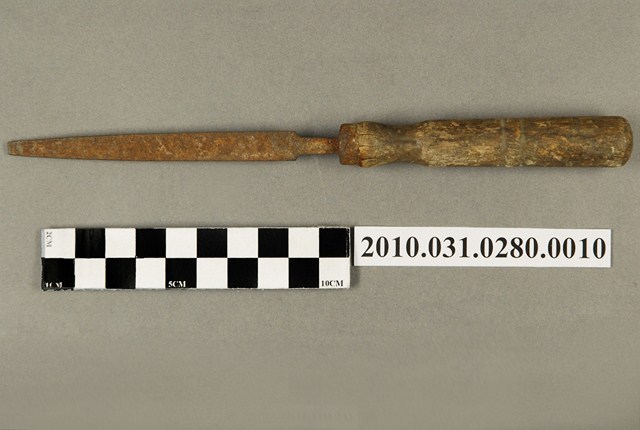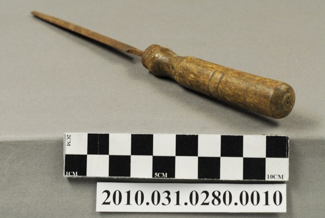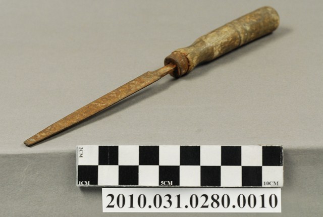 1.本物件為帶柄半圓銼,為手工用具,用於去除工件上的微量部分,常用於手工工作,形狀扁平,一邊具有網狀或齒狀凸起,可以磨擦方式清除物件表面細小的區塊,至尾端收縮變細,一邊為木製的圓形把手。金屬部分已生鏽。