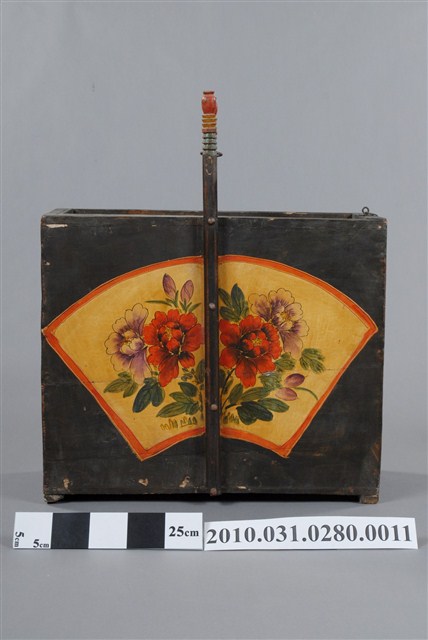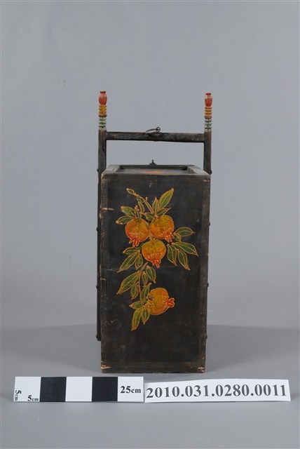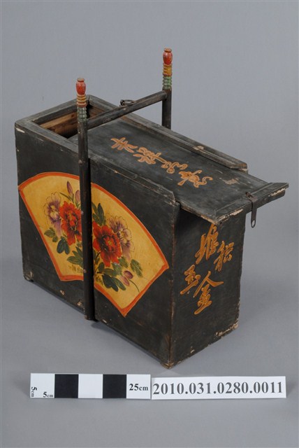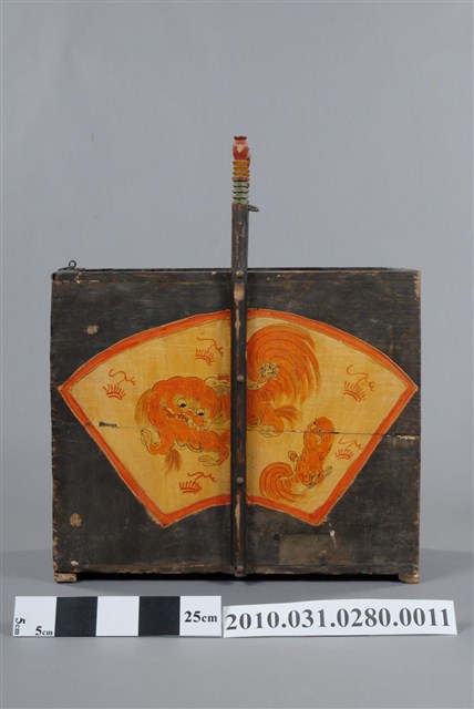 1.本物件為堆金積玉木箱,為早期攤販挑物、放置物品的器物,為一黑色長方形的木箱,兩旁有2根木棍連接上方1根橫向的木棍形成提把,提把中央有一鐵環,可掛於扁擔上。箱子上方木板可打開,內部可放置物品。木箱四面皆印有圖案,正面印有金色「堆金积玉」4字,順時針轉動箱子,下一面為一扇形圖案,內部為2隻一大一小橘色獅子的吉祥圖案;下一面為金線描成的石榴圖案;下一面為一扇形圖案,內部繪有花卉,最上方寫有1行金色文字「吉祥如意」。