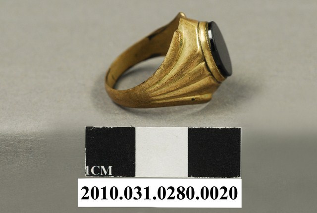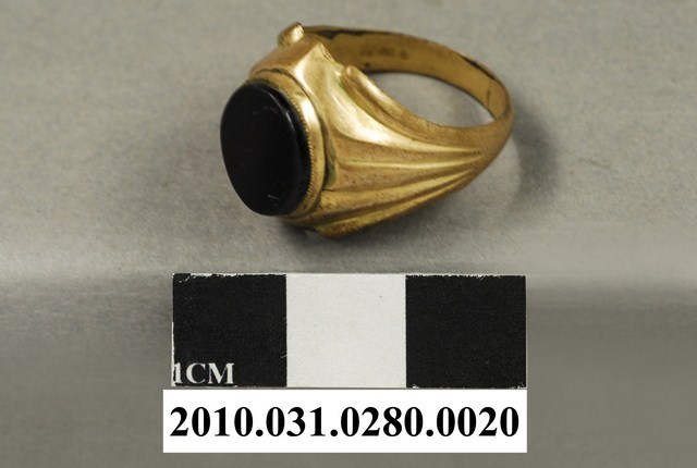 本物件為銅戒,為黃色銅製戒指,正面中央寬大,並鑲有黑色玉石,戒身延伸至後方寬度收縮變窄。