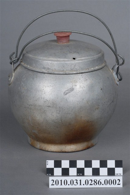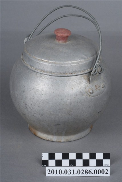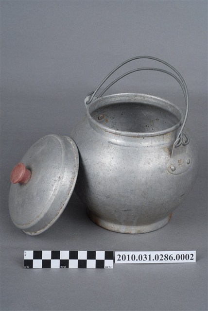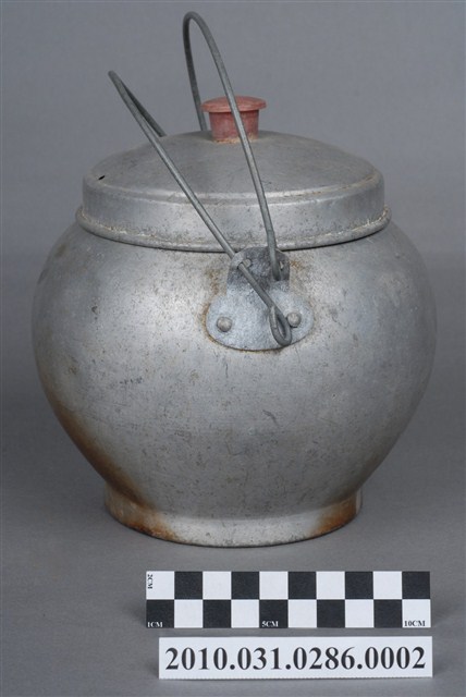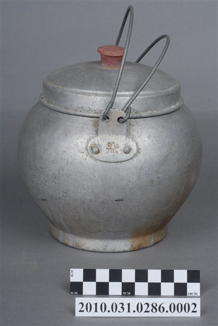 本件為豆花攤組配件之一鋁水壺,圓形鼓腹無流嘴,附蓋與金屬線提把,長約17公分,寬約16.2公分,高約19.9公分。壺蓋中央有一塑膠鈕,蓋面無裝飾,至邊緣壓有一圈同心圓飾紋,接著垂直向下形成套住壺身,蓋緣向外反摺呈滾邊。壺身整體為圓形燈籠狀,壺口邊緣呈外摺滾邊,直口連至壺身,鼓腹,至下半部內縮,底部為圈足。壺身兩側上半部釘有金屬片,片上各兩孔洞,以兩條粗鐵絲穿孔呈壺的提把。一側金屬片上壓有「泰山」字樣與山與雲的圖案,推測為此壺的生產商標誌或品牌。