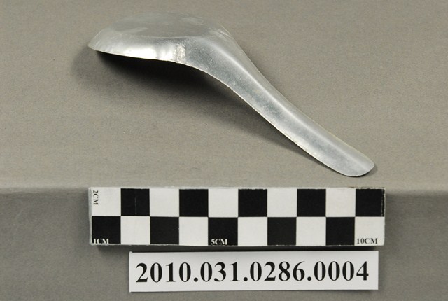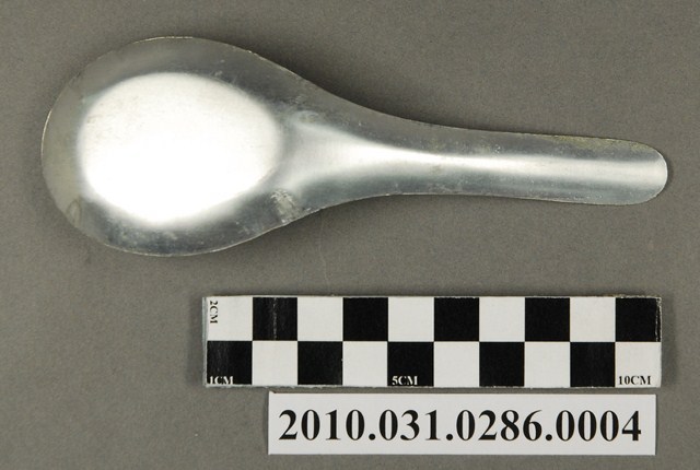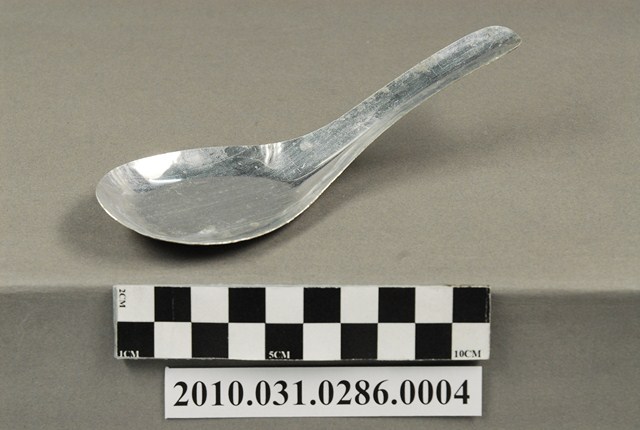 本件為豆花攤組配件之一吃豆花用的湯匙。湯匙以鋁合金製成,長約13.5公分,寬約4.7公分,高約3.7公分,整體表面有氧化痕跡。湯匙為中餐式湯匙,柄與匙一體成形製成,匙的部分為平底,匙壁深廣。整體並無任何裝飾與紋樣,邊緣有些微壓痕,應是於生產過程中產生。此湯匙為豆花攤提供予消費者飲食用。
