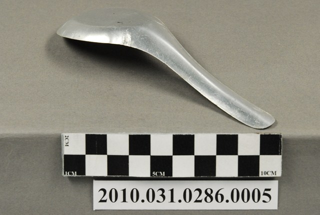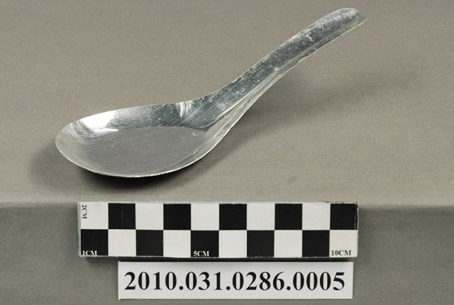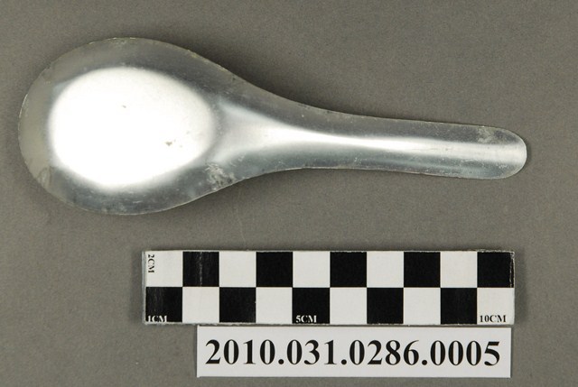 本件為豆花攤組配件之一吃豆花用的湯匙。湯匙以鋁合金製成,長約13.6公分,寬約4.7公分,高約3.5公分,整體表面有氧化痕跡。湯匙為中餐式湯匙,柄與匙一體成形製成,匙的部分為平底,匙壁深廣。整體並無任何裝飾與紋樣,邊緣有些微壓痕,應是於生產過程中產生。此湯匙為豆花攤提供予消費者飲食用。