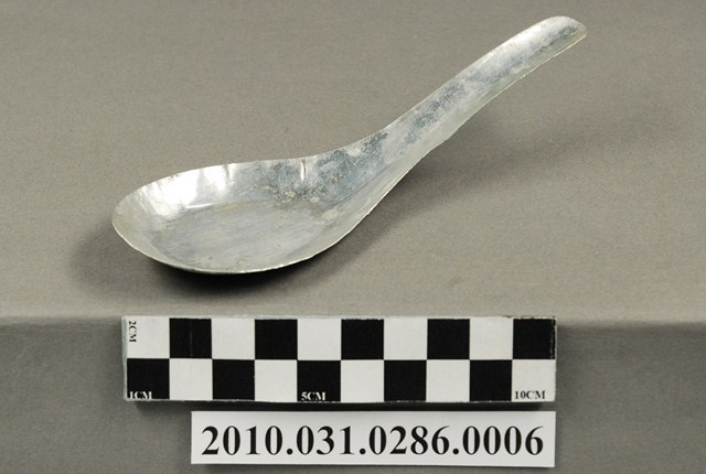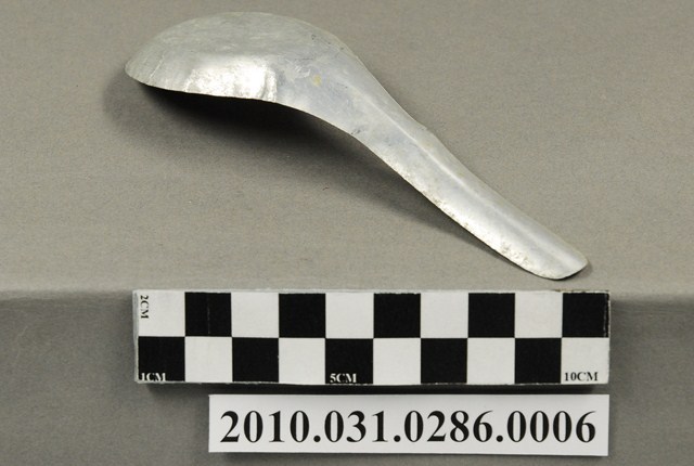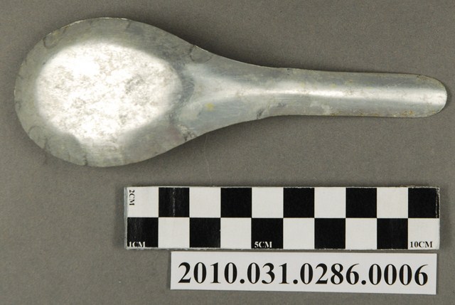 本件為豆花攤組配件之一吃豆花用的湯匙。湯匙以鋁合金製成,長約13.6公分,寬約4.7公分,高約3.5公分,整體表面有氧化痕跡。湯匙為中餐式湯匙,柄與匙一體成形製成,匙的部分為平底,匙壁深廣。整體並無任何裝飾與紋樣,邊緣有些微壓痕,應是於生產過程中產生。此湯匙為豆花攤提供予消費者飲食用。
