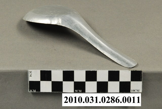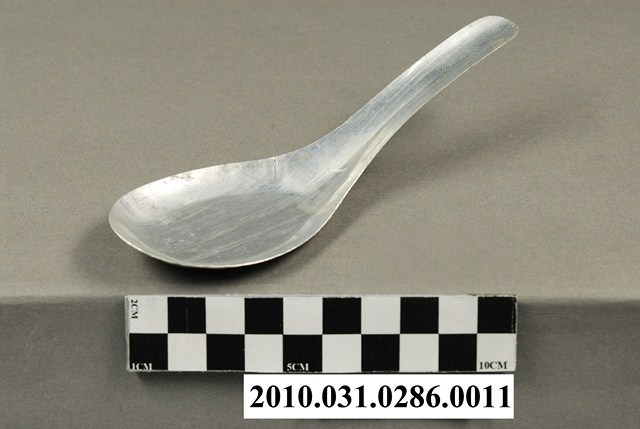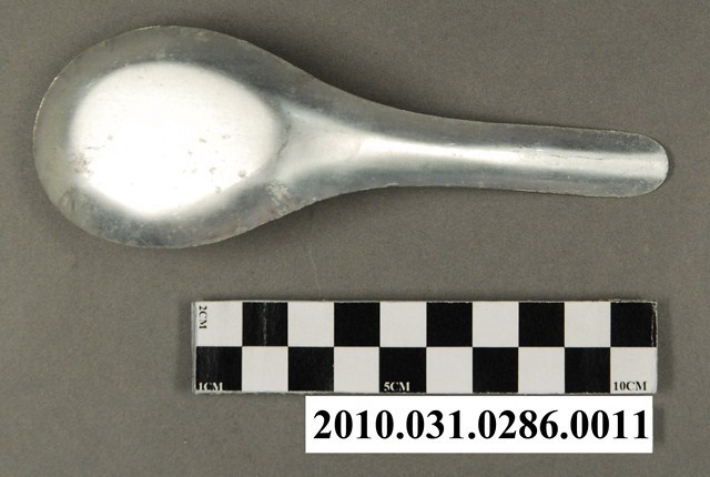 本件為豆花攤組配件之一吃豆花用的湯匙。湯匙以鋁合金製成,長約13.5公分,寬約4.7公分,高約3.7公分,整體表面有氧化痕跡。湯匙為中餐式湯匙,柄與匙一體成形製成,匙的部分為平底,匙壁深廣。整體並無任何裝飾與紋樣,邊緣有些微壓痕,應是於生產過程中產生。此湯匙為豆花攤提供予消費者飲食用。