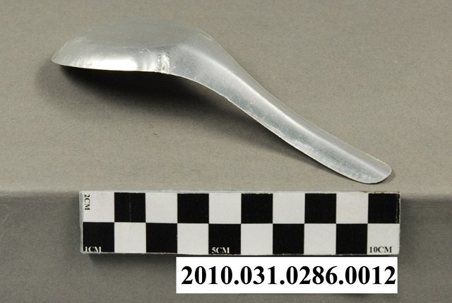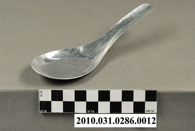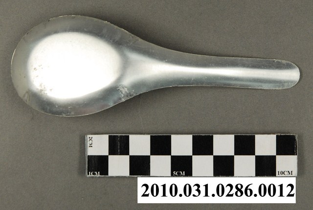 本件為豆花攤組配件之一吃豆花用的湯匙。湯匙以鋁合金製成,長約13.5公分,寬約4.7公分,高約3.6公分,整體表面有氧化痕跡。湯匙為中餐式湯匙,柄與匙一體成形製成,匙的部分為平底,匙壁深廣。整體並無任何裝飾與紋樣,邊緣有些微壓痕,應是於生產過程中產生。此湯匙為豆花攤提供予消費者飲食用。
