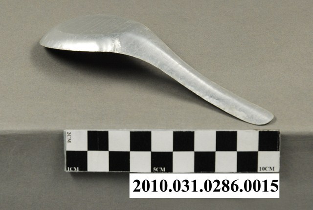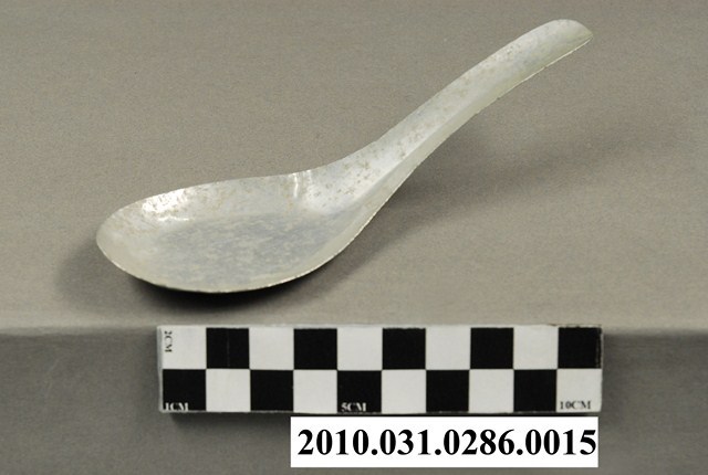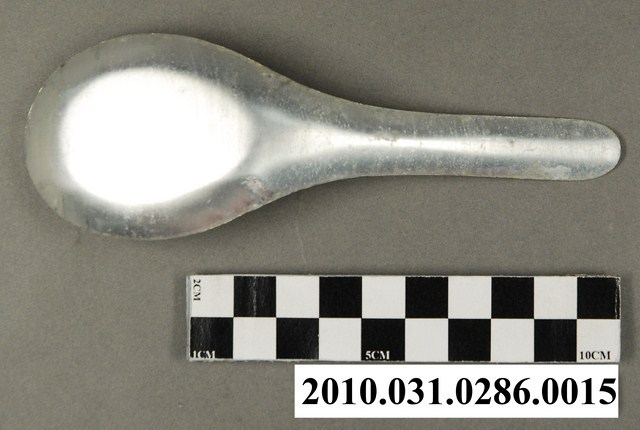 本件為豆花攤組配件之一吃豆花用的湯匙。湯匙以鋁合金製成,長約13.6公分,寬約4.7公分,高約3.4公分,整體表面有氧化痕跡。湯匙為中餐式湯匙,柄與匙一體成形製成,匙的部分為平底,匙壁深廣。整體並無任何裝飾與紋樣,邊緣有些微壓痕,應是於生產過程中產生。此湯匙為豆花攤提供予消費者飲食用。