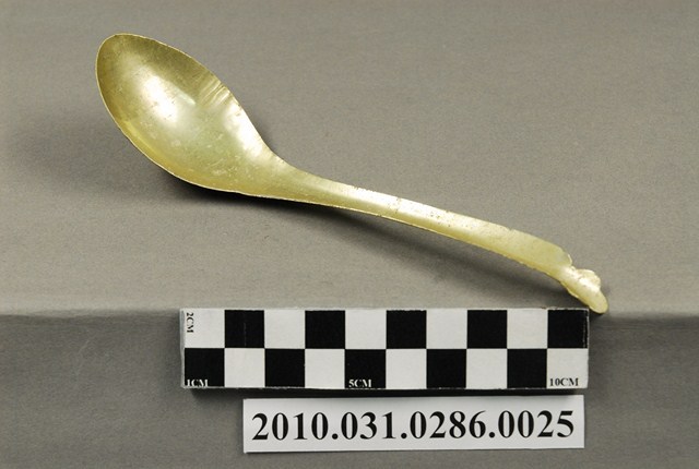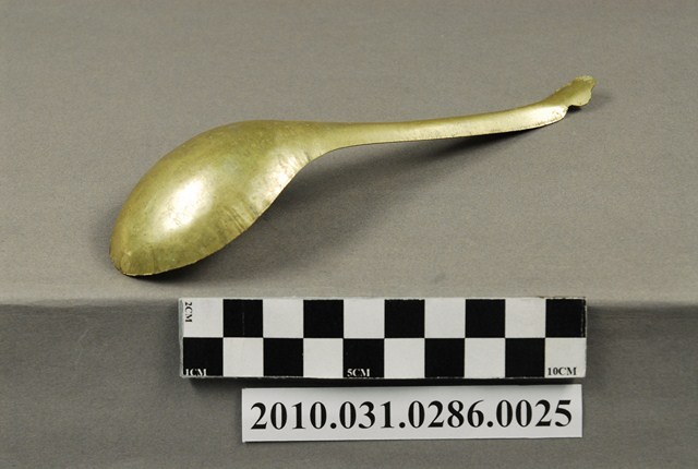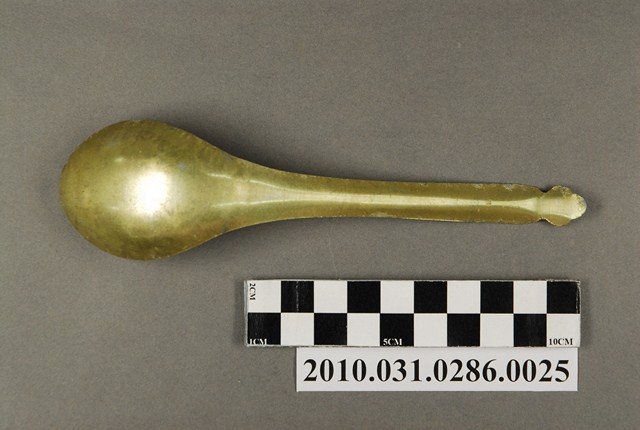 本件為豆花攤組配件之一吃豆花用的湯匙,以鋁製成,表面鍍銅,呈金黃色,長約15.4公分,寬約4公分,高約3.3公分。湯匙為中餐式湯匙,柄與匙一體成形製成,匙的部分為深圓弧形,匙壁深廣。匙柄頂端做花形裝飾,整體並無任何紋樣,邊緣有些微壓痕,應是於生產過程中產生。此湯匙為豆花攤提供予消費者飲食用。