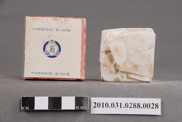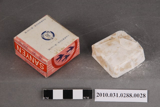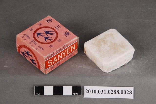 本物件為金三燕香粉,物件包含紙盒及一香粉塊。紙盒為粉紅色,中央為註冊商標,一紅色雙層圓內有三隻燕子,商標上方印「金三燕」,下方印「KING SAN YEN キン サン エン」;紙盒背面則為白色,中央印有一「菊」圖樣,上、下方印「中央標準局註冊:第176967號」。紙盒四周則有中、英文印製「BEST QUALITY」、「SANYEN」、「香粉 BRAND」及註冊商標等。香粉則以紙張包裏,為一方塊,封口處及正面可見泛黃痕跡。