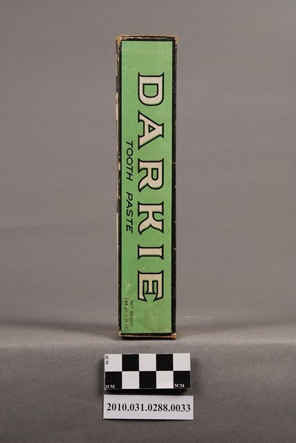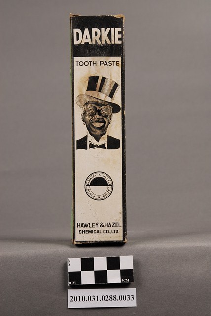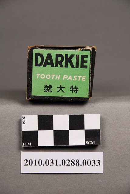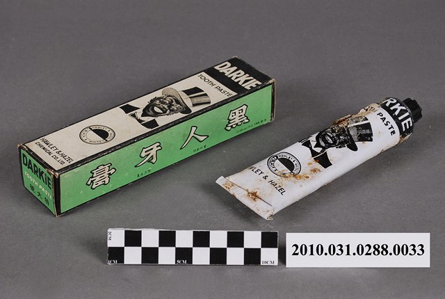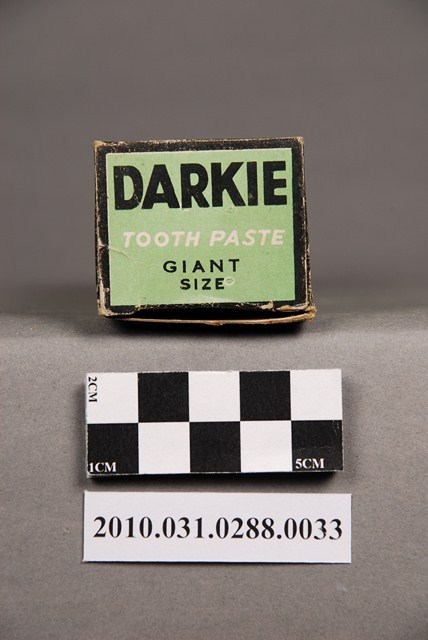 本物件為黑人牙膏特大號,物件包含紙盒及金屬管裝牙膏一管。紙盒正面為黑白色調,上方以黑底白色印「DARKIE」,中央為一斜戴禮帽之黑人頭像,頭像下方有一以圓形組成,形似人頭的圖樣,最下方印「HAWLEY & HAZEL CHEMICAL CO., LTD.」(中譯:好來化工股份有限公司)。背面之黑人圖像部分有黃色污損痕跡。紙盒兩側則為綠底,以黑框白字各印「黑人牙膏」及「DARKIE」。紙盒上、下兩端則為綠底,印有「DARKIE TOOTH PASTE」,「特大號」、「GIANT SIZE」字樣。牙膏管身由金屬製成,上有一黑色塑膠蓋,牙膏管身的圖樣與紙盒正面圖樣配置相同,管身有些微受擠壓的情況,管身有褐色鏽蝕痕跡。