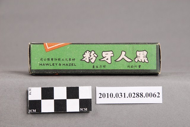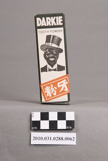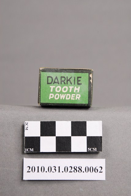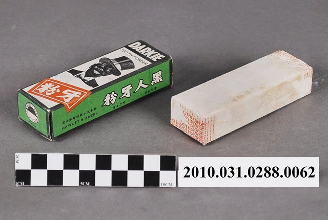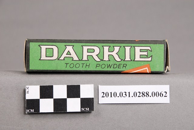 本物件為好來化工股份有限公司製黑人牙粉。文物包含紙盒與牙粉塊。紙盒正、反面為黑白色調,最上方為黑底白字「DARKIE」,下方的白色區塊印有「TOOTH POWDER」字樣,及斜戴禮帽露齒而笑黑人之頭像。下方則黏貼一張橘底白字「牙粉」貼紙。兩側面及上下盒蓋均以綠色為底,黑色或白色字體印「DARKIE」、「TOOTH POWDER」、「黑人牙粉」等字樣。牙粉塊以紙包住,首、尾兩端印有「DARKIE POWDER」紅色字體,包住牙粉的紙張已有泛黃痕跡。
