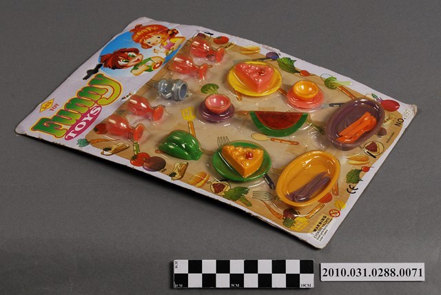 本物件為兒童玩具,材質為塑膠,以紙板與膠模封存。紙板上方有一吊掛孔,左上方印「Funny TOYS」,右上方為兩名正在扮家家酒的兒童,下方則為各式蔬菜、廚房用具的圖案。左下角為警告標誌,右下角則印有「NO.997」。封存玩具的膠膜已泛黃。玩具計有四個酒杯、一個酒壺、一串香蕉、兩組盤子加蛋糕、兩組拖盤加杯子、一片西瓜、兩組橢圓形盤加刀、叉、湯匙。紙板背面為卡其色,貼有一張產品相關資訊的貼紙。