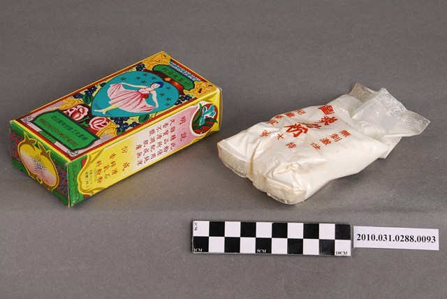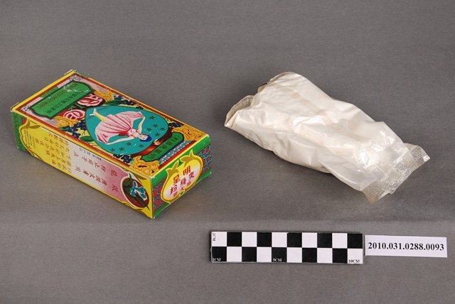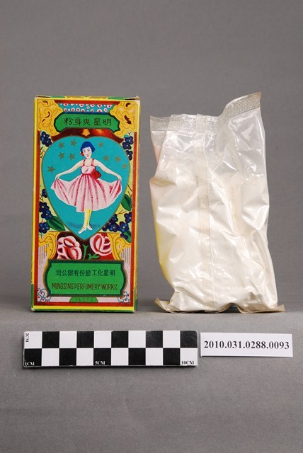 本物件為明星化工股份有限公司製明星爽身粉。物件包含一紙盒及一袋未開封爽身粉。紙盒上印有「明星爽身粉」、著粉紅舞衣舞者圖案及「明星化工股份有限公司」。紙盒左右兩面各印有效用及說明事項,並飾有花邊及花卉圖案。袋裝爽身粉的塑膠袋正面印有「明星爽身粉」、「無剌激性」、「兒童最宜」、「特大號」字樣,背面可見塑膠袋之接縫處。內為約九分滿,未開封之爽身粉。本物件與登錄號2010.031.0288.0016、2010.031.0288.0017、2010.031.0288.0094-2010.031.0288.0096藏品相同。