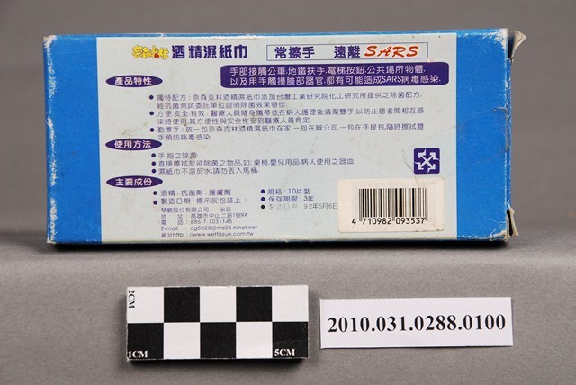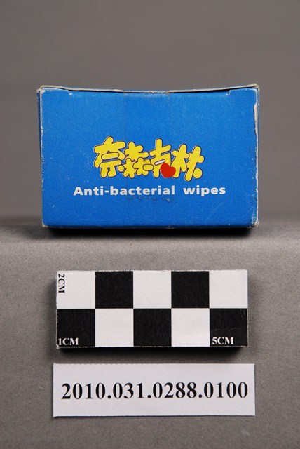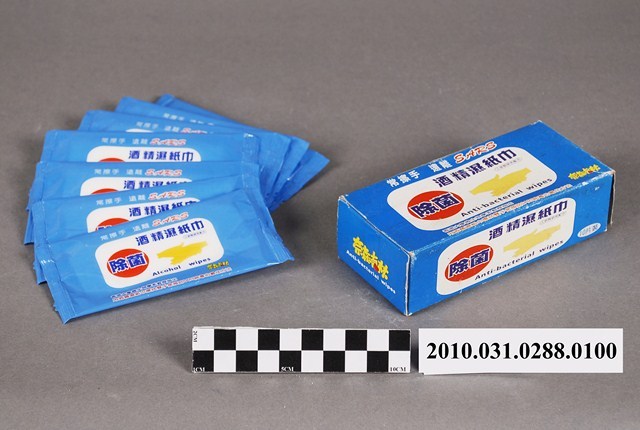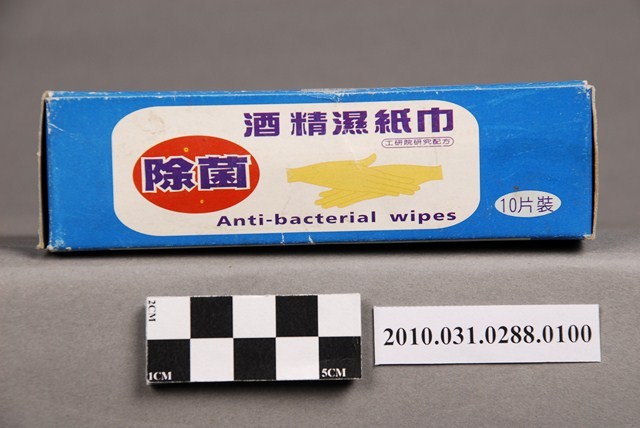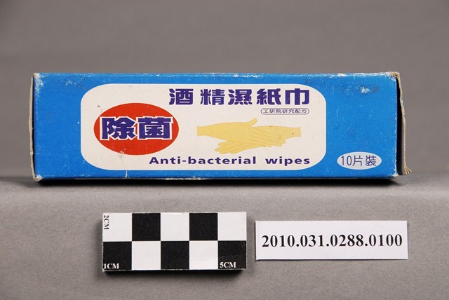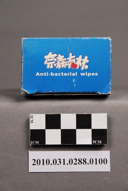 本物件為琴觀股份有限公司出品奈森克林酒精濕紙巾,物件包含紙盒及獨立包裝之濕紙巾。紙盒主體為藍色,正面中央白色區塊印「酒精濕紙巾」、「除菌」、「工研院研究配方」、雙手圖案、「Anti-bacterial wipes」,白色區塊上方印「常擦手 遠離SARS」、下方印「香港大學微生物學系教授指出 用酒精濕紙巾擦拭雙手是預防SARS病毒的最佳方法」,右下角為「奈森克林」。紙盒反面則載有產品名稱、特性、使用方法、主要成份等各項介紹。紙盒內裝之酒精濕紙巾均為獨立包裝,紙盒標示內容為十片裝,本物件內含七片。