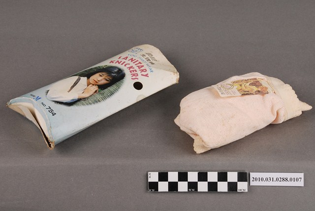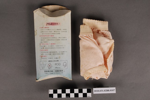 本物件為象象製衣廠及玉興被服廠製象牌生理褲,物件包含紙盒及生理褲一件。紙盒中央圖像為一斜倚樹幹之短髮少女,圖像上方印有一象形商標、「象牌生理褲」、「YOU JUST WEAR SANITARY KNICKERS」等字樣,圖像下方則有「size M」、「NO 754」字樣。紙盒背面為生理褲之介紹及注意事項,最下方印有「象象製衣廠.玉興被服廠」及電話。生理褲為粉紅色,布面有同色花朵圖案,標籤上則一古典女子側身像及尺寸、型號等資訊。