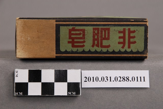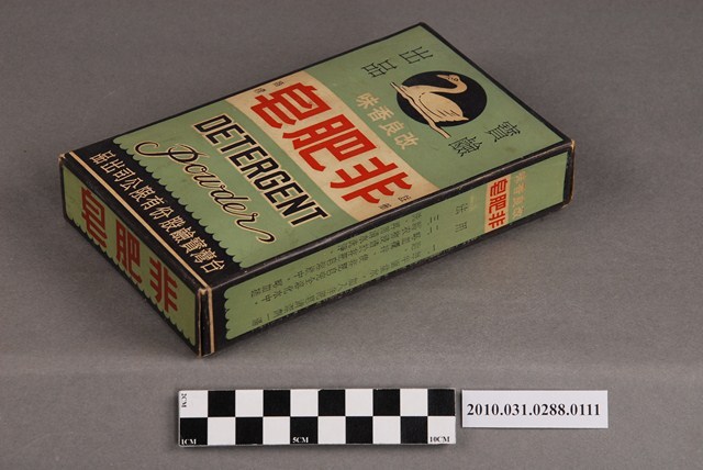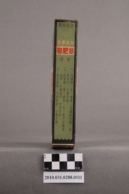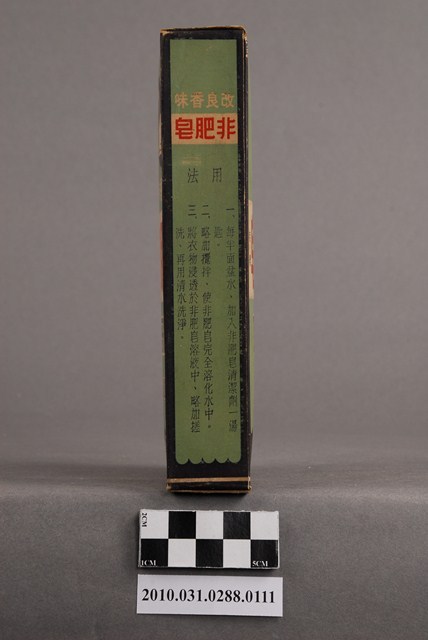 本物件為臺灣寶鹼股份有限公司出品之非肥皂。紙盒正、反面為綠底藍框,最上方為天鵝圖像,左右兩端印「寶鹼出品」,下方為「改良香味」。中間白色區塊以紅字印「非肥皂」,左右以小字印「註冊商標」。下方綠色區域以英文印「DETERGENT」、「POWDER」。最下方藍色區塊則以白字印「台灣寶鹼股份有限公司出品」。紙盒兩側印有產品的用途及用法。紙盒上端印有「非肥皂」,左方有一卡其色正方形區塊,為由側面「由此拆開」處撕開後使用處。紙盒下端印有「非肥皂」三字。本物件與登錄號2010.031.0288.0110藏品相同。