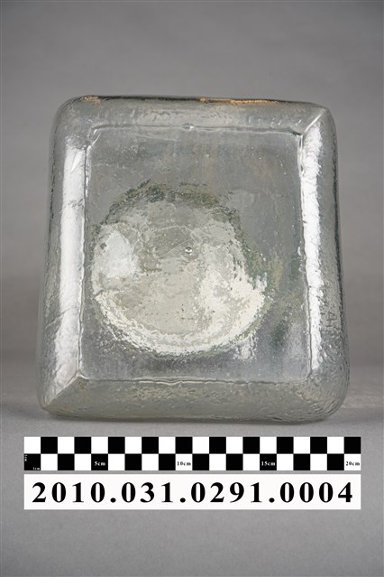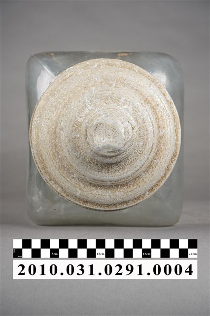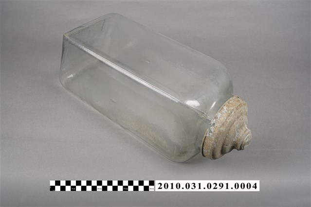 此件糖果罐蓋由鋁製罐蓋透明玻璃製成,長約15.4公分,寬約46.1公分,高約16.5公分,整體呈梯型。罐蓋中央突起為鈕,外圈以三層同心圓壓紋造型,並漸進式向下傾斜,至邊緣垂直向下形成套住玻璃罐身的部分,蓋緣向外反摺呈滾邊。瓶身玻璃厚實,整體為梯形,罐口位於側邊為直筒狀,至罐身連接處向外突起呈四面筒狀至罐底,罐底做傾斜狀,為配合層架微微傾斜,使糖果罐陳列於層架時,罐口會稍微往上。