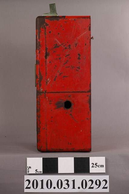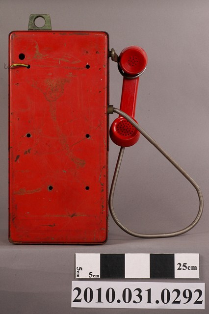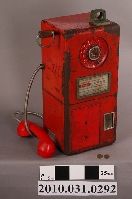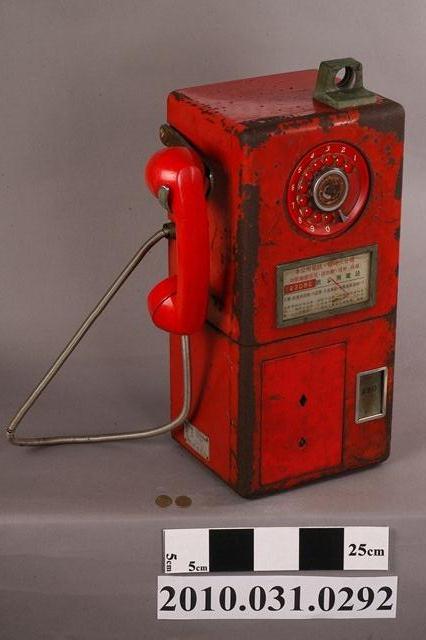 1.本物件為公用電話,主要為金屬材質。物件外觀為紅色,正面可見0-9號碼撥盤、電話使用說明的金屬標示牌、下方可見退幣口。物件側面上方懸掛1個紅色話筒。