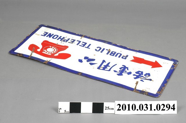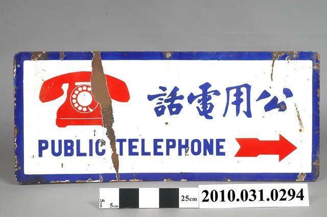 1.本物件為公用電話鐵牌,長方形鐵片,四角為圓弧狀,邊緣共有8處鑽孔。上面印有藍色的公用電話、PUBLIC TELEPHONE等字,以及一臺紅色電話圖案及一個標示向左的紅色箭頭。邊框為藍色。