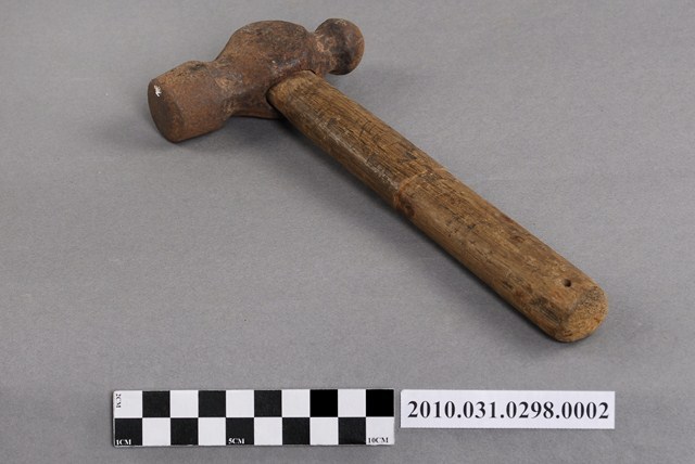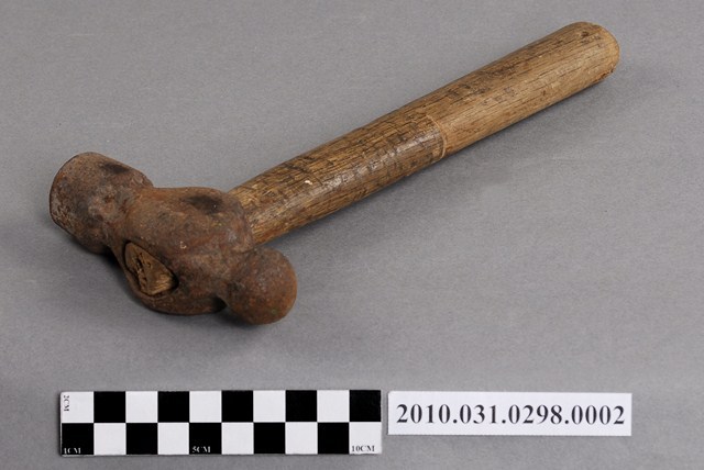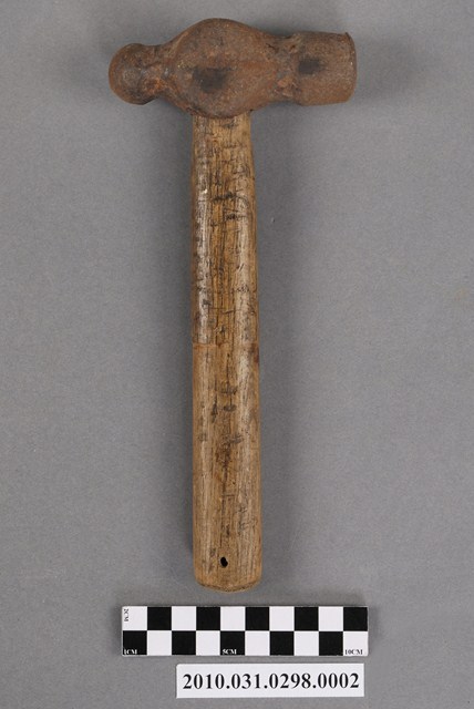 1.本物件為一把鐵鎚,鐵製槌頭一端呈平頭一端呈圓球狀,安裝在圓棒形木製握柄上。鐵鎚可用來敲打鐵釘固定屐耳(鞋帶)於鞋面上。