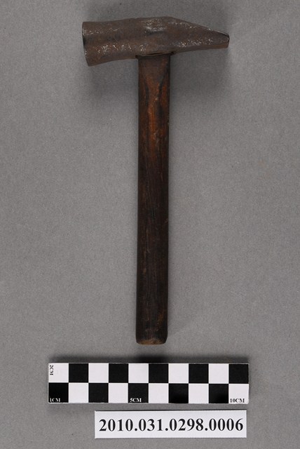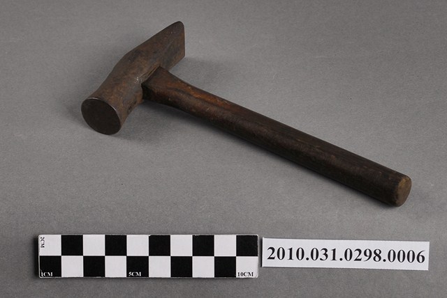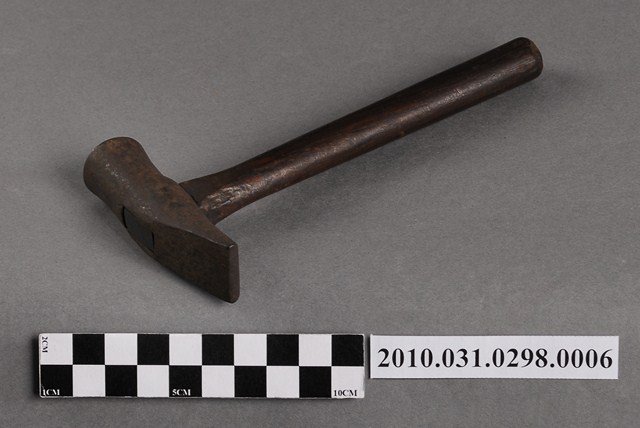 1.本物件為一把鐵鎚,鐵製槌頭一端呈尖頭一端呈平頭,安裝在圓棒形木製握柄上。鐵鎚可用來敲打鐵釘固定屐耳(鞋帶)於鞋面上。