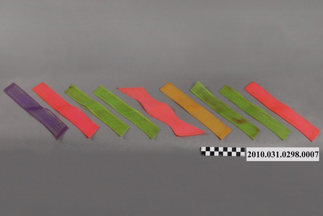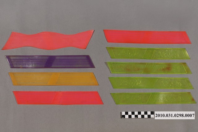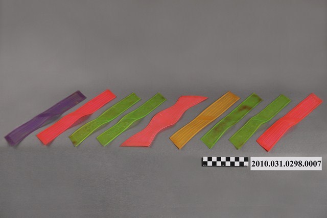 1.本物件為九片塑膠製的木屐左側屐耳(鞋帶),分別有浮雕圖樣的綠色四片、直條紋粉紅色三片(其中一片外型呈波浪狀)、直條紋橘色一片、直條紋紫色一片。