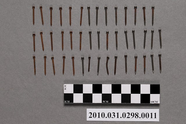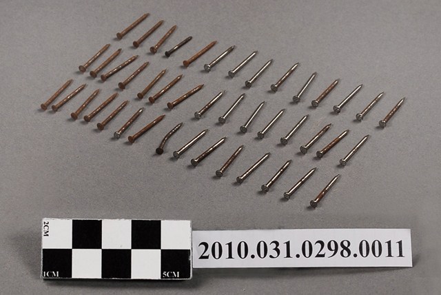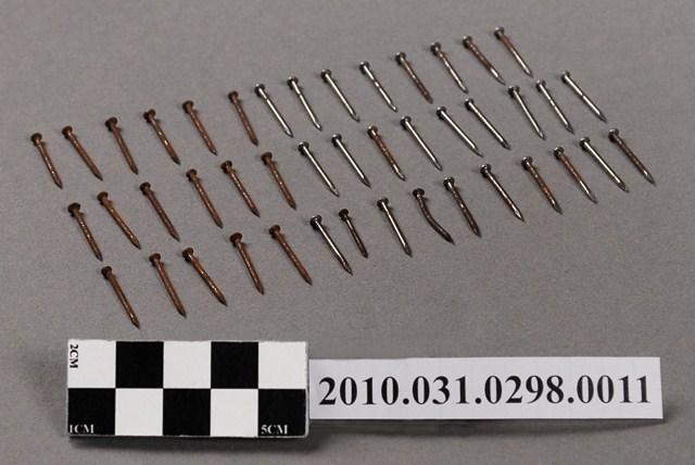 1.本物件為製作木屐所使用的小鐵釘,共有四十四根。鐵釘是用來釘牢木屐屐耳 (鞋帶)的工具。