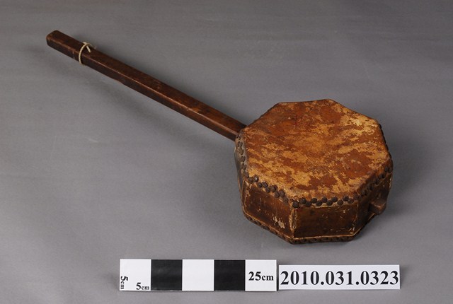 本件八角手鼓作正八邊形之鼓身,鼓身作木製八邊形短桶狀,兩面蒙牛皮以鉚釘固定作為打擊面,在其中一邊裝上一根四角形木棍作為握柄,木棍下半端穿洞繫棉繩以利懸掛。手鼓之皮面有大面積污漬產生,鼓身之漆面也有污漬脫落情形。