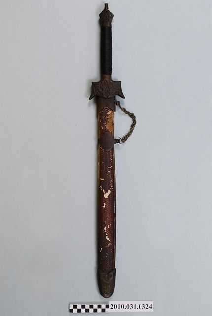 本件法劍帶有劍鞘,劍身為不銹鋼鑄造。劍柄為木製包覆銅件,劍刃為不繡鋼製,兩面嵌有七個代表北斗七星的圓點,護手及頓頭為銅鑄。劍鞘為不銹鋼製,劍柄的握把以及上端的護手、下端的頓頭皆為銅製。劍鞘表面髹漆,漆面有暗沈、剝落現象,劍鞘靠近口部及三方之一處又鑲有兩件環扣並繫有金屬鍊以利配掛,劍鞘中段飾有一條行龍紋,尾端亦鑲有銅件。