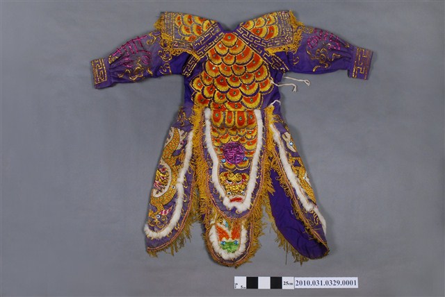 1.本件為八家將一件式紫色長袖法服,紫色的綢布繡上各種吉祥紋路的服飾,一件式法服包含甲衣和甲裙。甲衣為長袖,胸部與背部為魚鱗紋。甲裙樣式為4塊布片,前後片鏽上老虎,左右片是降龍,又稱龍虎裙。2.八家將的巡捕理論,有學者認為是清代縣署巡捕組織的神格化。扮將者身穿法服,頭戴盔帽,足踏草鞋,手執法器或刑具,不僅能震懾陰司,也能警訓世間。