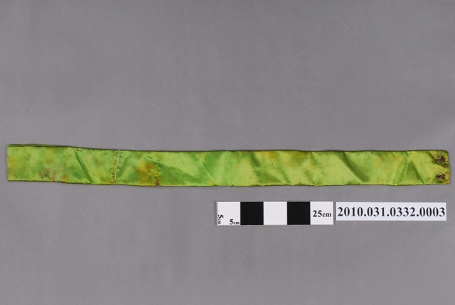 1.本件為八家將腰帶,綠色的綢布以繡上5個黃色壽字紋,腰帶作為八家將法服的服飾配件。2.八家將的巡捕理論,有學者認為是清代縣署巡捕組織的神格化。扮將者身穿法服,頭戴盔帽,足踏草鞋,手執法器或刑具,不僅能震懾陰司,也能警訓世間。
