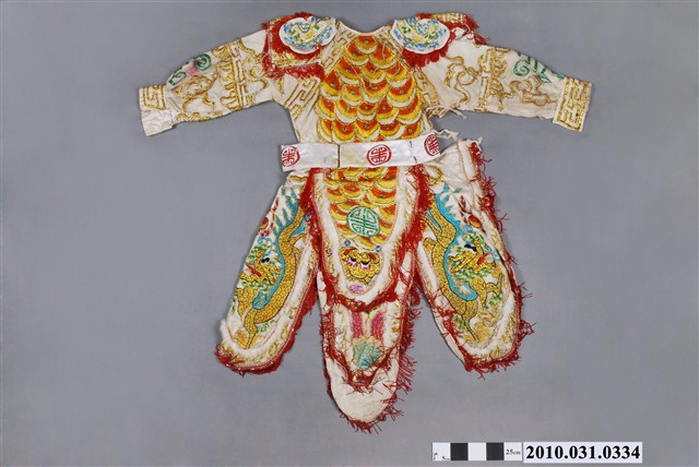1.本件為八家將白色法服1套,白色的綢布繡上各種吉祥紋路的服飾,包含一件式長袖甲衣和甲裙(龍虎裙),以及配件雲肩(披肩)和腰帶。2.八家將的巡捕理論,有學者認為是清代縣署巡捕組織的神格化。扮將者身穿法服,頭戴盔帽,足踏草鞋,手執法器或刑具,不僅能震懾陰司,也能警訓世間。