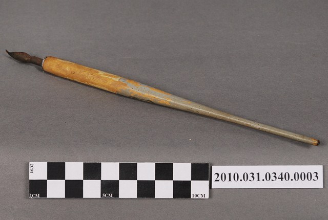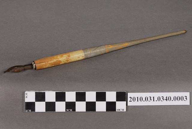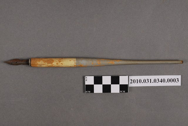 本文物為沾水筆。沾水筆筆頭為金屬尖頭製品。筆桿是由粗到細,握筆處較粗,頂部為細長型。筆桿外木質顏色的包裝模剝落,頂部露出原始色調。