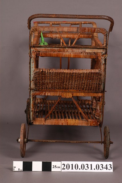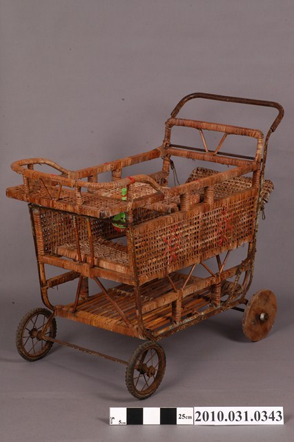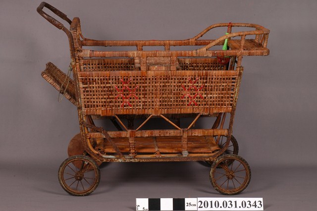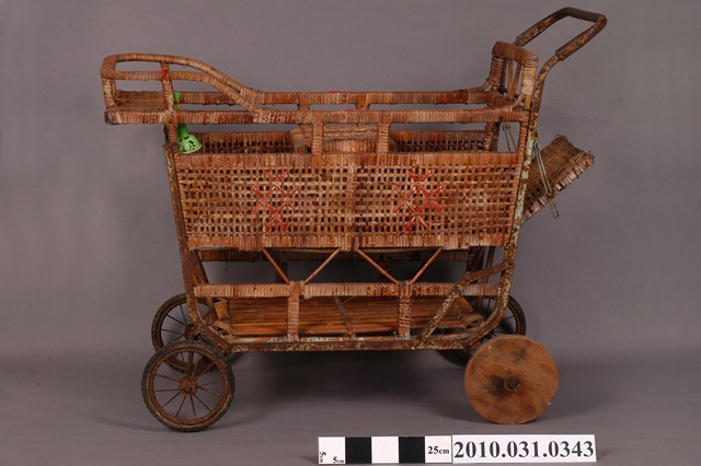 本文物為藤製嬰兒床,主體為箱型,並分為上下兩層,下層可製物,上層給嬰兒躺、站,且兩邊有拉桿,下方有4輪子,推拉拉桿可使其搖動。育嬰孩為傳統婦女在家之重要工作,嬰兒床使女性無須時時刻刻揹著嬰孩進行勞動。