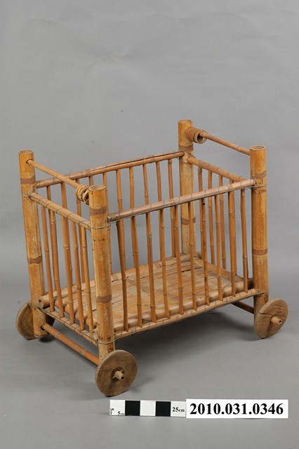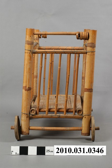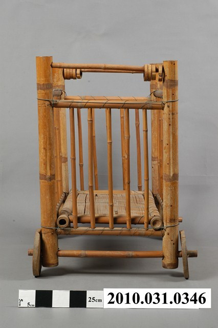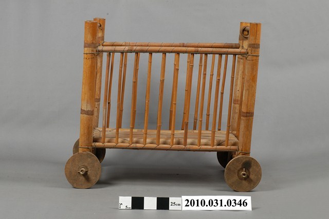 本文物為竹製乳母車,主體為長方體型,可給嬰兒躺、站,四周以圍成柵欄撞,避免嬰兒隨意移動,下方有4輪子,推拉拉桿可使其搖動。育嬰孩為傳統婦女在家之重要工作,乳母車使女性無須時時刻刻揹著嬰孩進行勞動。