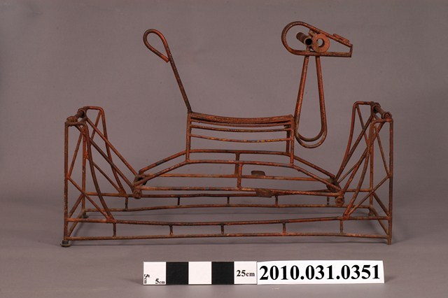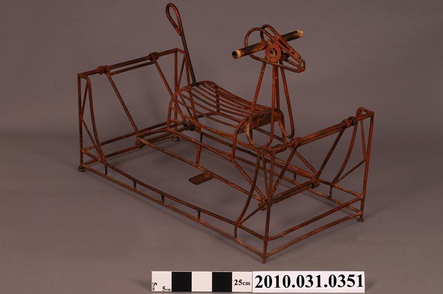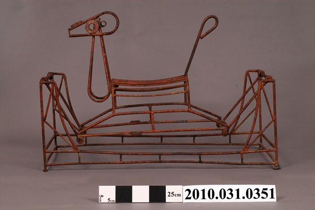 1.本物件為鐵製搖擺馬,材質為鐵質,整體為暗紅色且有鏽蝕,物件上半部為鐵馬造型,以暗紅色繡蝕鐵條組成之馬造型構件,馬頭上有握桿,下方有供腳踩踏處構件一組;下半部為凹字型構件,以暗紅色繡蝕鐵條組成,前後較高,使其可供騎乘者前後搖擺。
