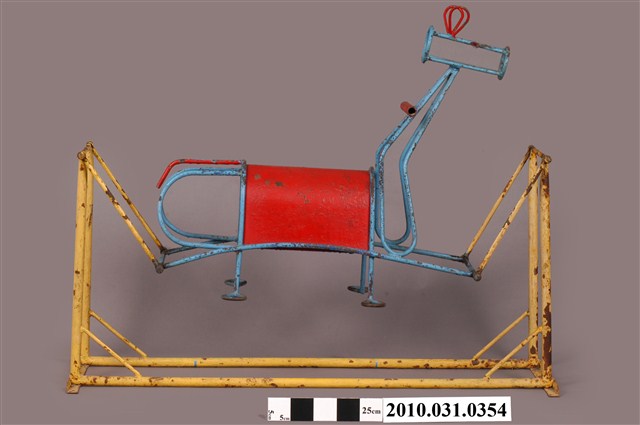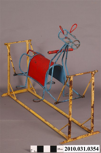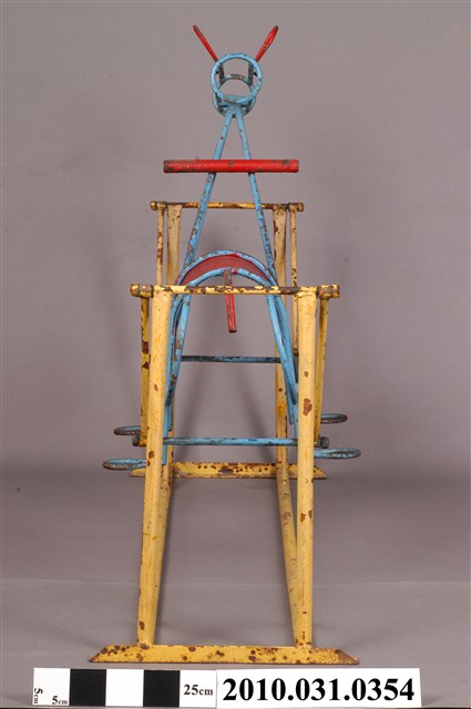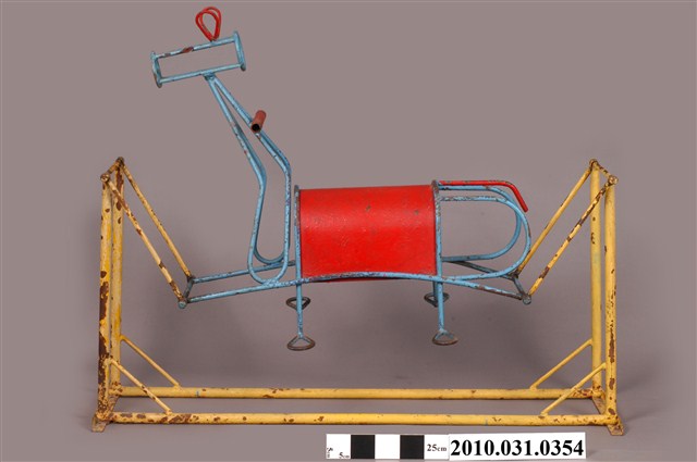 1.本物件為鐵製搖擺馬,材質為鐵質,物件上半部為鐵馬造型,以藍色繡蝕鐵條及一片紅色拱形鐵片組成之馬造型構件,馬頸上有紅色握桿,馬頭上有紅色鐵條所組成之耳朵,後方則有紅色鐵條作為馬尾,下方有供腳踩踏處構件兩組;下半部為凹字型構件,以黃色繡蝕鐵條組成,前後較高,前後皆有可動式接榫與鐵馬連結,使其可供騎乘者前後搖擺。