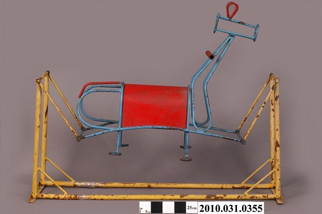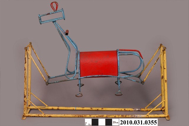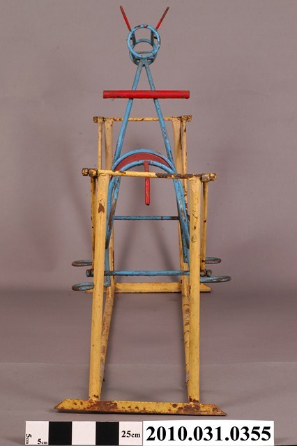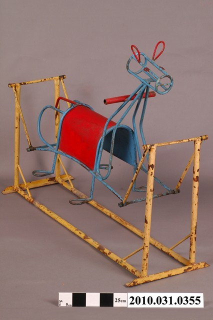 1.本物件為鐵製搖擺馬,材質為鐵質,物件上半部為鐵馬造型,以藍色繡蝕鐵條及一片紅色拱形鐵片組成之馬造型構件,馬頸上有紅色握桿,馬頭上有紅色鐵條所組成之耳朵,後方則有紅色鐵條作為馬尾,下方有供腳踩踏處構件兩組;下半部為凹字型構件,以黃色繡蝕鐵條組成,前後較高,前後皆有可動式接榫與鐵馬連結,使其可供騎乘者前後搖擺。