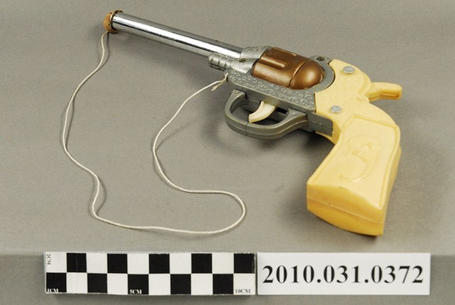 本物件為玩具手槍,複合材質。手把顏色為亮黃色,轉輪顏色為古銅色。此玩具手槍屬轉輪手槍類,槍管上有一個木塞子彈,有一條棉線連結至槍身。