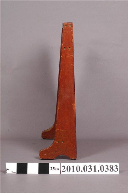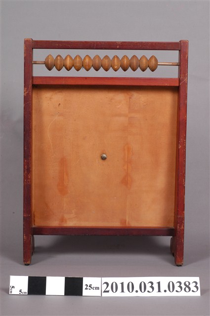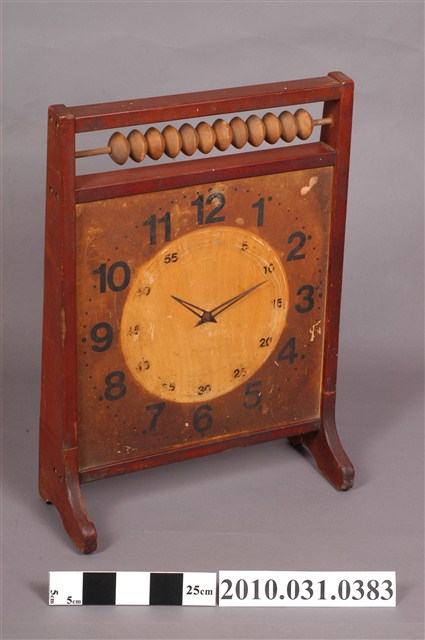 本文物為教學用時鐘。時鐘為木製品,可站立。鐘面為方形,有時針與分針和兩圈數字,內圈為5、10、15、20、25、30、35、40、45、50、55,外圈為1、2、3、4、5、6、7、8、9、10、11、12,外圈數字外圍有60個黑點。鐘面上方串有12顆算珠,算珠為飛碟型,算珠可移動。