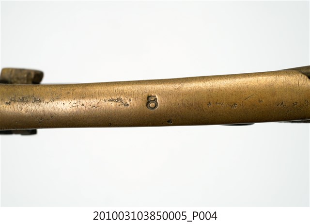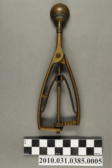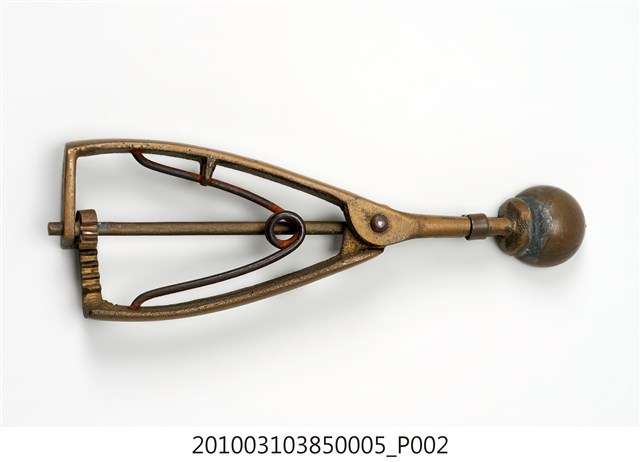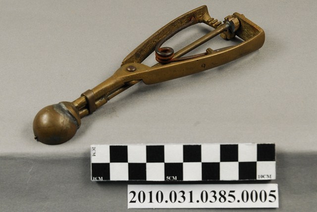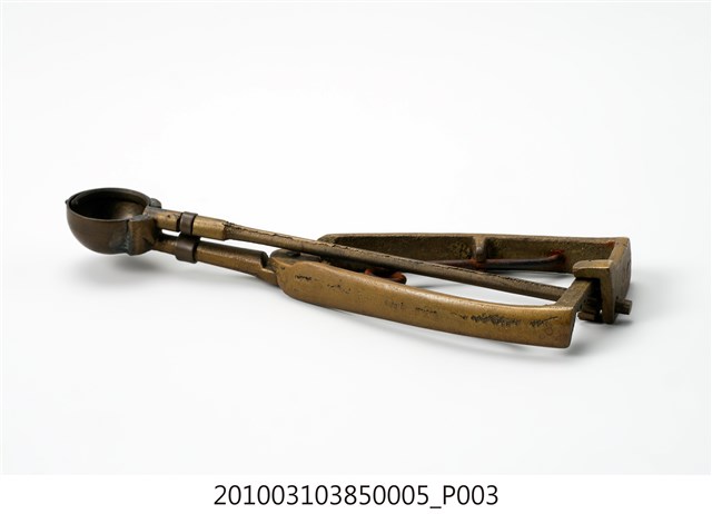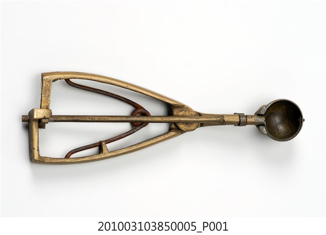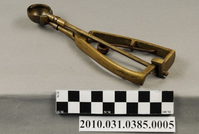 本件為天霸王芋冰販售器具組配件之一,為挖小球芋冰的銅冰杓,以黃銅製成,長約5.3公分,寬約16.6公分,高約1.9公分。冰杓由兩個交疊的半圓球形杓與杓柄組成,杓柄側邊壓有數字「8」,是採用簡單機械原理的器具。使用時,先將杓插入冰淇淋中,手部緊壓杓柄,杓柄會牽動轉軸,帶動上方的半圓球形杓轉動,接著舀起冰淇淋,再將加緊得杓柄鬆開,轉動的半圓球形杓及轉回原位,舀好的冰淇淋球便掉入備好的容器中。