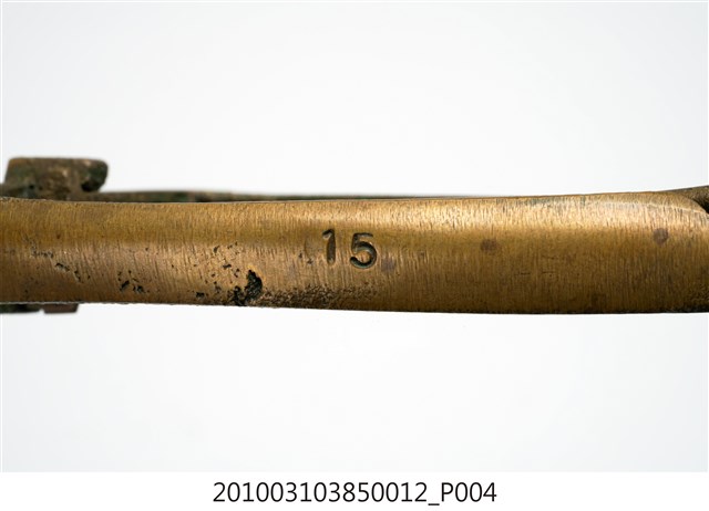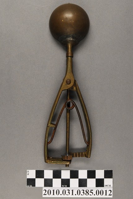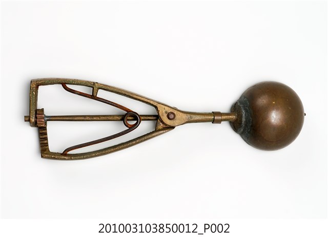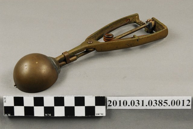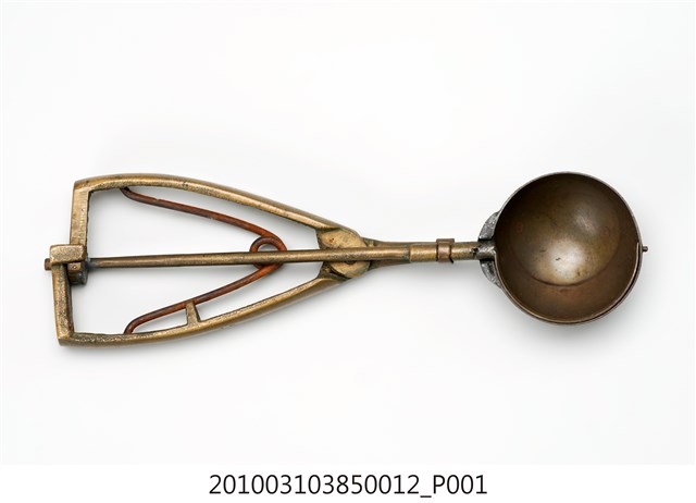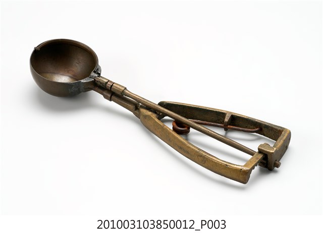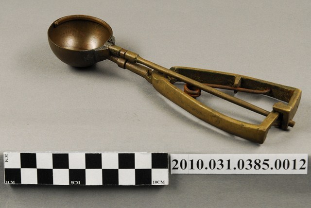 本件為天霸王芋冰販售器具組配件之一,為挖大球芋冰的銅冰杓,以黃銅製成,長約5.4公分,寬約18.7公分,高約2.8公分。冰杓由兩個交疊的半圓球形杓與杓柄組成,杓柄側邊壓有數字「15」,是採用簡單機械原理的器具。使用時,先將杓插入冰淇淋中,手部緊壓杓柄,杓柄會牽動轉軸,帶動上方的半圓球形杓轉動,接著舀起冰淇淋,再將加緊得杓柄鬆開,轉動的半圓球形杓及轉回原位,舀好的冰淇淋球便掉入備好的容器中。